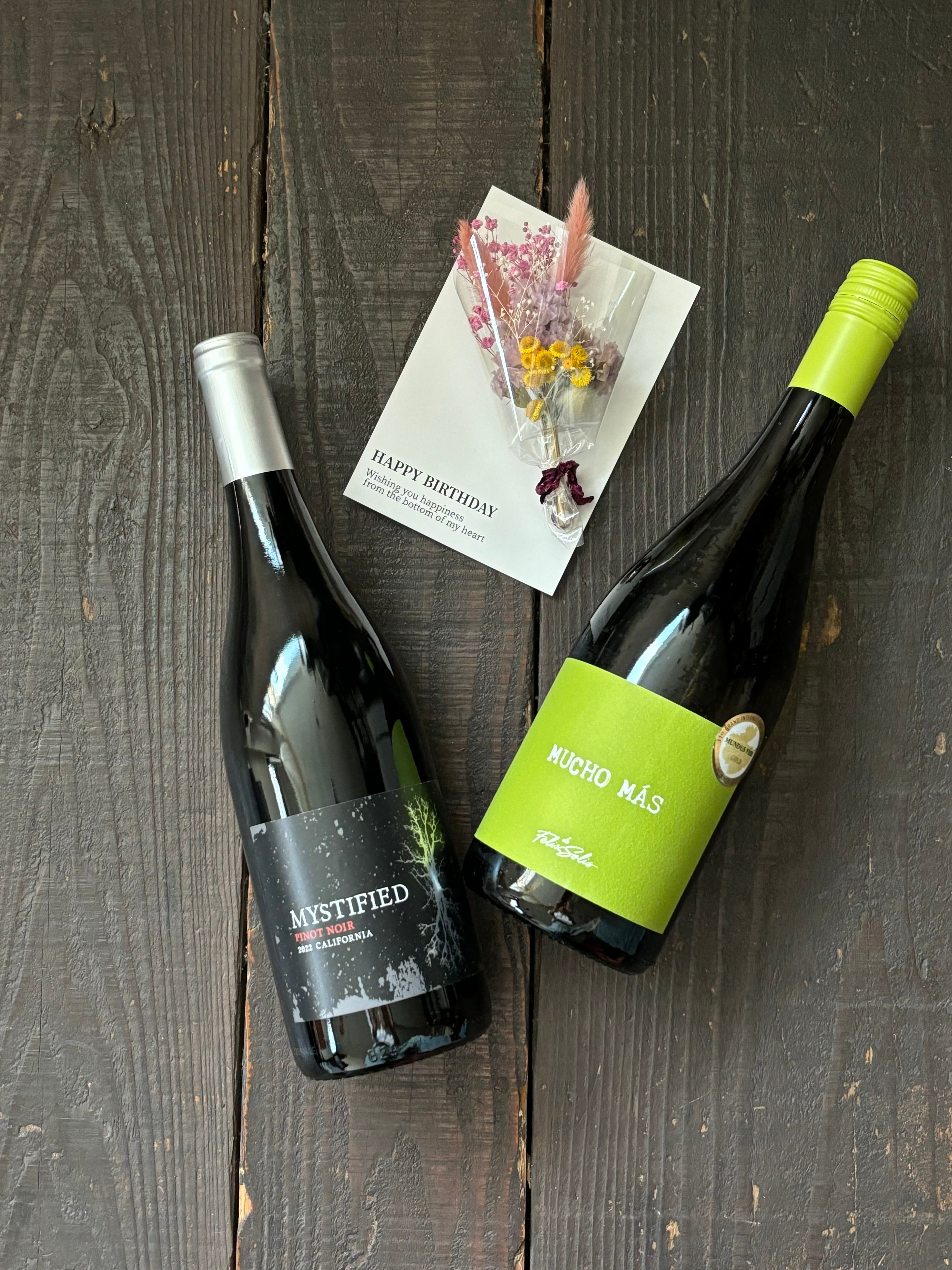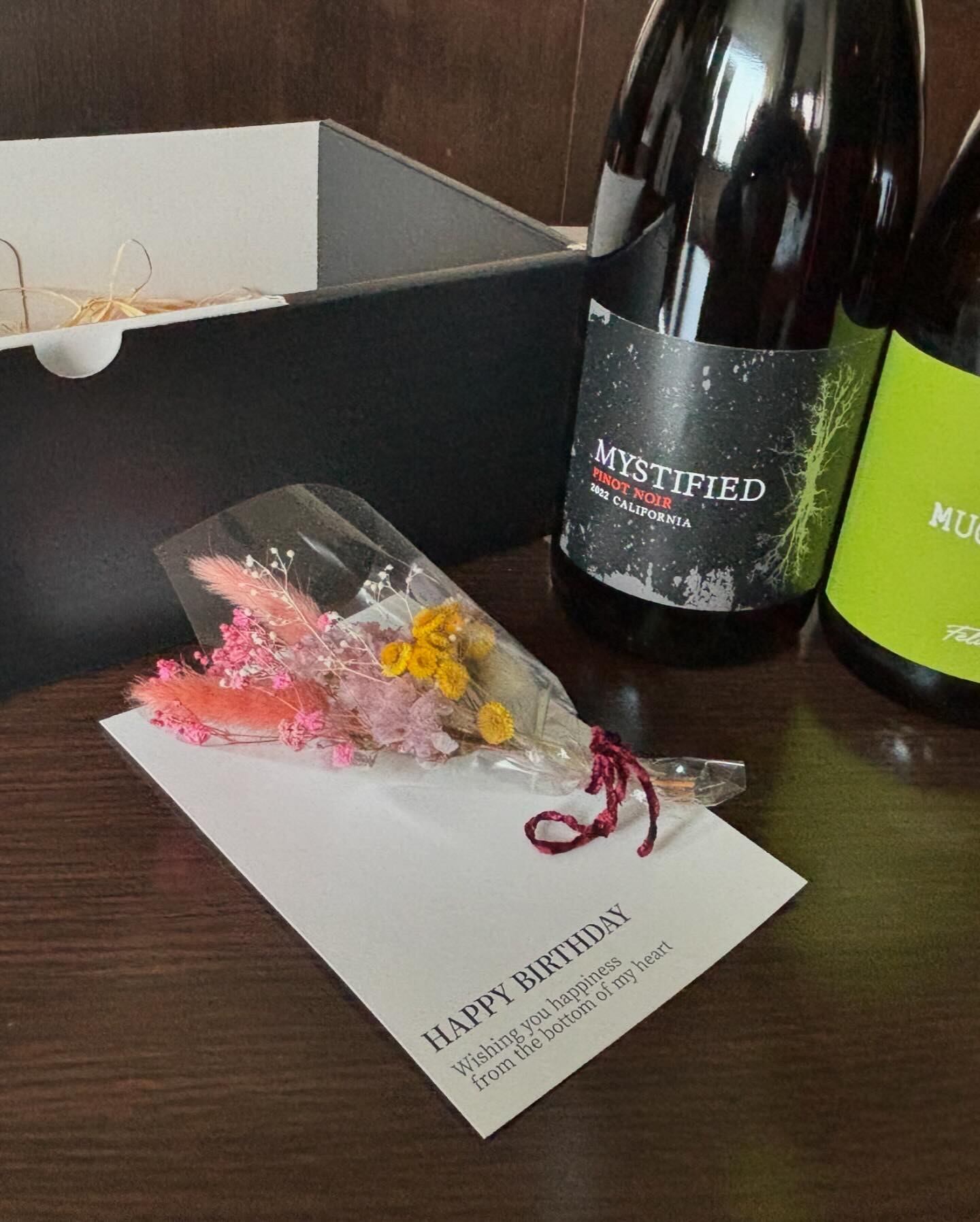 心のこもったプレゼントにぴったりなハートフルワインギフト。ドライフラワーのミニブーケとメッセージカードが美しいデザイン